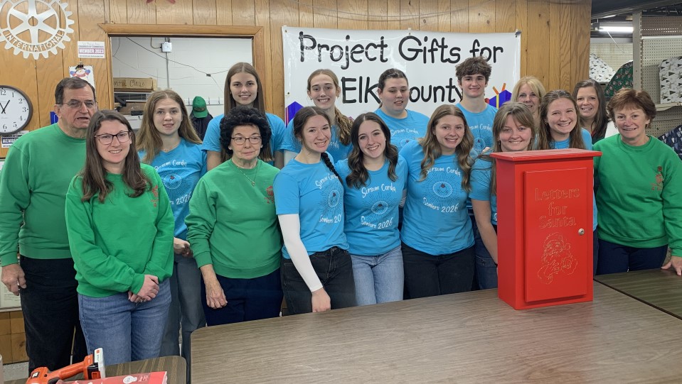 Pictured is the final group of helpers from the Senior Class at Elk County Catholic High School. Also pictured is the special red box made by Reed’s Custom Woodworking that was used for dropping applications at out location downtown.